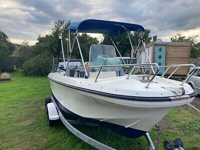 Fast fishing boat and trailer Suitable for 6 to 8people Evinrude outboard motor150hp Engine ingood condition can be seen running20feet Boats in good condition for age not sureof age of boats the evinrude engine is from 1995so assuming both possible same age or newerSuitable for leisure waterski and Inflatables anall-rounder on the sea plenty of fun could beused for some type of commercial trade divingsomething like that also has canopy over thepilot area canopy material has a little bit of sunbleaching but still in good condition there is alsoa swim ladder at the rear of the boat and also anexhilarate outboard motor bracket adjustablealso can be used for leisure on canal in pitcheron Canal there are two wooden chairs at rear ofboats which are not included but it gives you anidea of space and obviously you could addchairs or a bench along rear of the boatViewing can be arranged just contact UsThe reason for selling not getting used As I haveanother boat and any time off I put into that so itneeds to go to a good home for somebody toenjoy Sorry to see it go