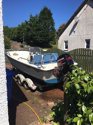 Cracking Dory style fishing/speed boat, sitting on a double axle bramber trailer in great condition.She is powered by a Mercury 60 HP outboard in perfect working order, power trim and tilt and all usual controls.Aux engine bracket fitted, I have a brand new Mercury 2 HP outboard which will be included if the buy it now is achieved.Both engines come with covers for extra protection when stored, fuel tank and all connections.Overall cover, for winter storageThis really is a great stable boat, easy to tow, launch and retrieve.The following items are not fitted, but will be included with the boat. SS A frame. Nav lights. VHF radio and antenna including coax cable. Anchor, ropes, bucket (for the catch). FM radio, speakers. Compass. Fishing jacket.. Small inflatable dingy, may have slight leak, but easily repaired. Fenders. Fish finder and hull transponder . Life jackets. Light board and extension leadThis needs a new home, as it isn’t getting the use it deserves, it’s ready to roll and chase the fish for the new season.Please come and have a look, you won’t be disappointed.Happy to answer any questions and assist with getting it to it’s new home.Thanks for looking.