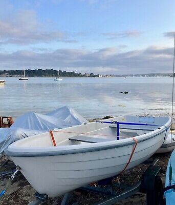 TERHI 385 BOAT – perfect for fishing, rowing, and days out on the water with friends and family!Approximately 12ft 6″ (380cm) Long X 5ft (150cm) Wide – rated for 4 people.Comes with road legal trailer, and wooden oars, so can be rowed. (The oars are a bit tatty and could do with re-varnishing, but nothing that detracts from their use.)There is no engine – We used it with our old 2hp Suzuki outboard (which has now been sold) and it was a lot of fun for the family around Poole Harbour. It would also suit an electric outboard!Not sure how old it is. The last 2 digits of the serial number are 06, so it ‘may’ be a 2006 model?Comes with wooden oars, AND its own road legal trailer.The mudguards are a bit rusty, which makes the trailer look tatty, but the bearings were replaced a month or so ago, and I have just fitted a brand new jockey wheel assembly – so it’s ready to go! A great boat from Terhi – acknowledged as one of the best and safest rowing boats for the family – and in my opinion, even more fun for the family with a small outboard!Manufacturers Specifications for Terhi 385 Boat:• Length:380 cm • Width: 150 cm • Weight: 98 kg • Number of passengers: 4• Engine: 2-6 hp • Max engine weight: 27 kg • Transom height: Short • Self-draining• Unsinkable construction**CASH ON COLLECTION ONLY****Collect from Studland, near Swanage in Dorset**WILL NOT REPLY TO SILLY OFFERS!