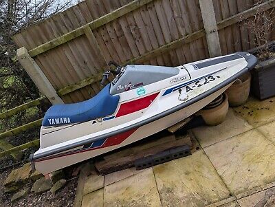 This is my 1990 Yamaha Marinejet 650T PWC Jetski.I bought this about 10 years ago from a marina on Lake Windermere with the plan on restoring it and I haven’t done a lot with it since, hence why it is now up for sale. The Windermere registration sticker shows it was last in the water in 1997. It was then laid up in the boat storage unit out the way until I bought her. She does need some work, hence why spares or repair.The hull, fiberglass, seat, stickers, jet drive, etc are in decent condition (for its age, it is 35 year old). I started to strip the engine on a sunny summer afternoon (with a beer) to see what the condition was like, hence why its partially striped. Basically it’s not seized but is very stiff. Not surprising considering how long its been stood. So it will need a rebuild, which is common/easier for a two stroke and may need refinishing rather then a re-bore. But I didn’t actually take the head off so I’m not sure. The jetski is complete apart from the following items. The CDI/ECU unit and the stop/start/kill cord switch. These were missing when I bought the jetski.Collection only from DE159SQ. There is NO trailer. So it would have to be taken away either on your own trailer or in a van. If wanted the current stand can be included. Please NO time wasters. Remember it cost me everytime to list it. If you want to view before bidding or have any question then feel free to contact me on 07904454838.Thanks for your time, Tom 🙂