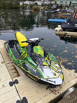 Seadoo spark 2016 90hp 3up with 109hrs Monster wrapped, manual reverse system, modified exhaust with rear exit, new style grips, genuine seadoo foot blocks, modified access hatch for spark plugs, front locker with lid, boarding step, cover and trailer Had spark plugs, battery, oil and filter at start of 2024 but has not been used, modified hatch to access top of engine without needing to removing body. 2nd owner and only used on freshwater at tattershall lakes Known ski since new and serviced Some stains to seat and slight scuffs on body due to use and age.