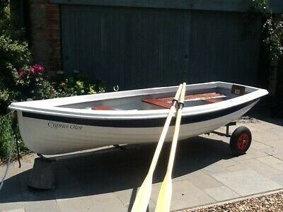 Heyland Duchess Rowing Boat for sale, collection only from Marshland St James, Norfolk.Open to sensible offers. Graceful 11ft river boat, fibreglass with mahogany trim and seats. Very good condition. Used twice only – (long story!) has been kept indoors undercover since then in 2008Comes with folding launching trolley and 2 wooden oars. Will throw in the outboard motor (isn’t working) as a fixer-upper.Length: 11’3 (340cm) Beam: 4’4? (132cm) Depth: 1’6? (45cm) Weight: 188-lb (85kg) approxFull details can be found on the Heyland Website: https://heylandmarine.com/duchess-rowing-boat/For collection only, payment via pay pal or bank transfer