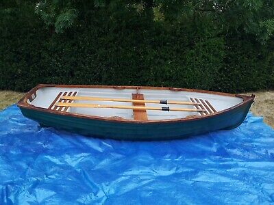 A 11ft fibre glass rowing boat with a mahogany rim, two small areas have been repaired. Supplied with Rowley Oars of distinction (See photo). Colour: British racing green. It has been in storage, before that it was only used on a lake, so in excellent condition. Heyland Marine boats are made in England (see their website)