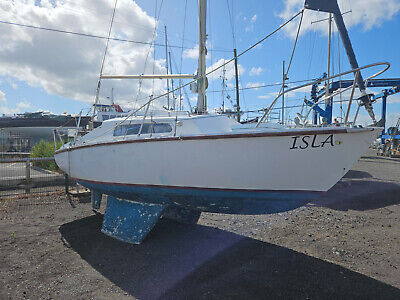 Hurley 20 – A great starter boat. Main and foresail. Four berths. Standard Horizon Eclipse DSC VHF. Fuse panel. MPPT Solar charge controller. Lowrance Hook Reveal 5SS fishfinder. Numax leisure 75Ah battery. Gas bottle. Twin burner hob.Mariner 5hp Fourstroke SailMate – F5MLHA. Ashore at Amble Marina, Northumberland. Abandonned on site so limited information. Storage costs: £36.60 per week inc VAT.Lift onto boat transport from £160.00.
