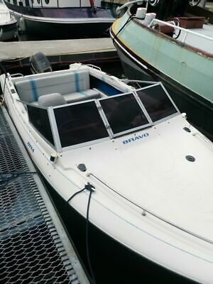 1990s Fletcher Bravo 15ft with 25HP (Tohatsu 2001)In the water on the river Thames at Chiswick Marina. This boat doesn’t come with a trailer but has a fully paid mooring till the end of September 2020.Good clean condition. 25hp Tohatsu, very economical and perfect for river cruising.Stainless steel propellorNew battery last season.Anchor and chainAuto BilgeMooring linesInternal and External fuel tanks.